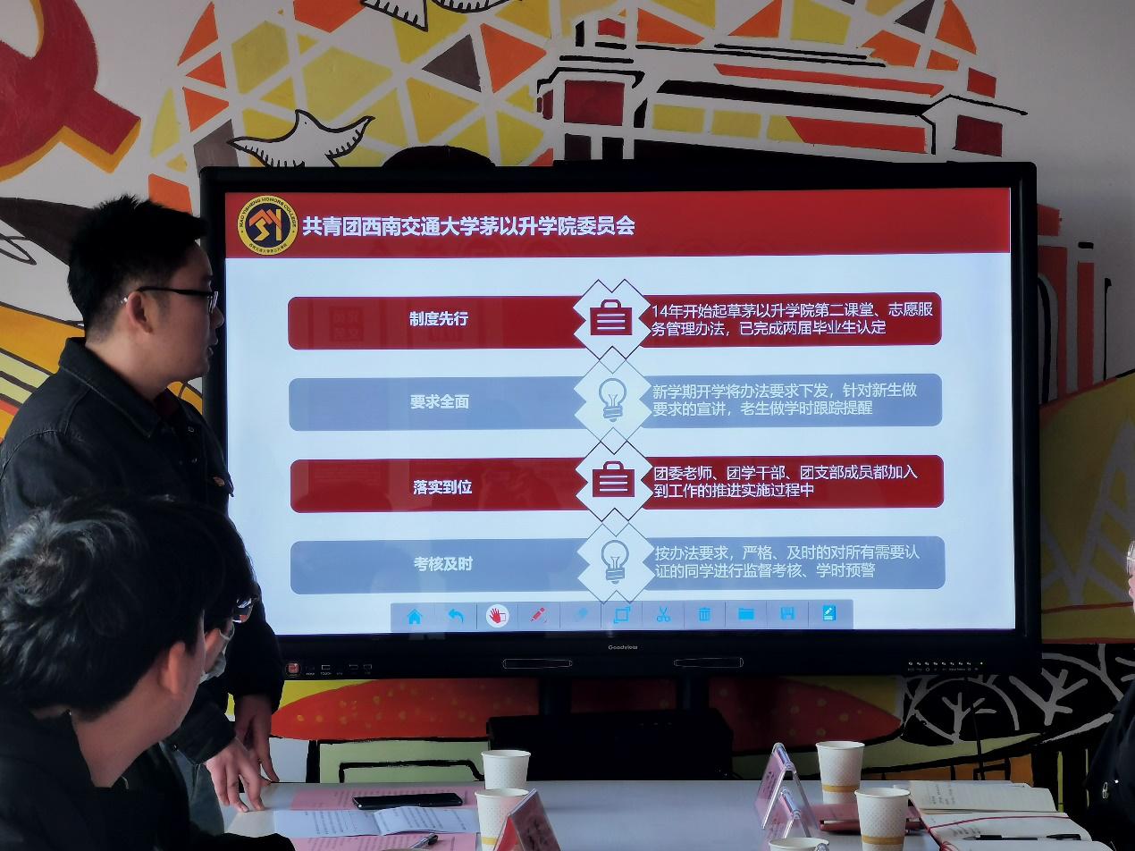 汇报之后,校团委相关负责同志立足工作实际,结合学院特色,与学院团委进行了充分的交流与研讨,并就存在的问题提出可行性解决方案。