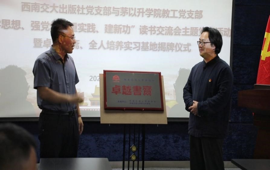 党总支书记甘霖、副书记王霞、综合管理办公室主任任凯利、组织员孟涵,以及出版社全体党员一起见证了卓越书斋的图书捐赠与全人培养实习基地的揭牌仪式。