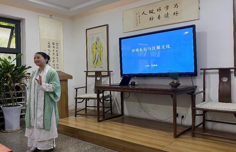 。景心老师是成都市国学研究会秘书长,广安市国学学会会长,南充市国学学会名誉会长。她为我们讲解了中华传统礼仪与汉服文化的知识,为大家带来一场精彩的国学盛宴。