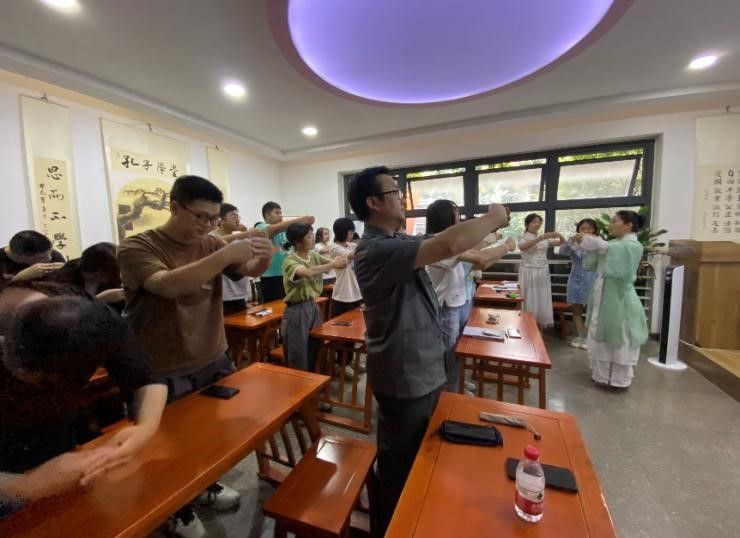 讲座正式开始之前,景心老师详细介绍了揖礼、拱手礼的区别及标准姿势,在场的师生认真学习,并向孔子像行三拜礼,拜礼时念诵张载的“横渠四句”:为天地立心,为生民立命,为往圣继绝学,为万世开太平。