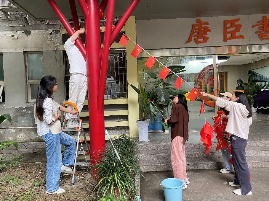 种下映山红,同志们又在书院门前挂上了国旗和党旗,为书院增添国庆热烈氛围,表达对祖国美好祝福的同时,也希望能感召唐臣青年们体会革命精神的深刻含义,懂得幸福生活的来之不易,也充分认识到在党的领导下,我们的国家取得的伟大成就。