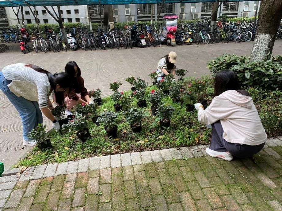 2023年9月28日下午,参加“双卓越”项目学生优秀党员自发开展了“种下映山红,红花迎国庆”志愿活动。同志们在书院门前的花台中种下了象征着革命精神的映山红,代表着青年党员对祖国的热爱,也表达了茅院学子对祖国的美好祝福。