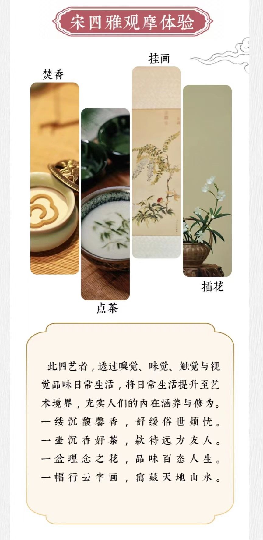 宋代是中国古代文明的高峰期,是“东方的文艺复兴”。《梦粱录》中记载:“焚香点茶,挂画插花,四般闲事,不宜累加”,点出了宋代文人的四事。研学老师详细讲解了这四事,即宋代“四雅”。生动有趣的讲解让研学的同学们受益良多,四艺合一是风雅与韵味的生活美学。