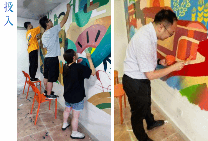 的同学也加入到了“一面美育墙”的墙绘创作之中,并和同学们一起进行了绘画体验。杨宏毅表达了对此次活动的期望和关注,他强调美育教育的重要性,鼓励同学们充分发挥自己的创造力和想象力,将对美的感知通过墙绘艺术的形式表达出来。
