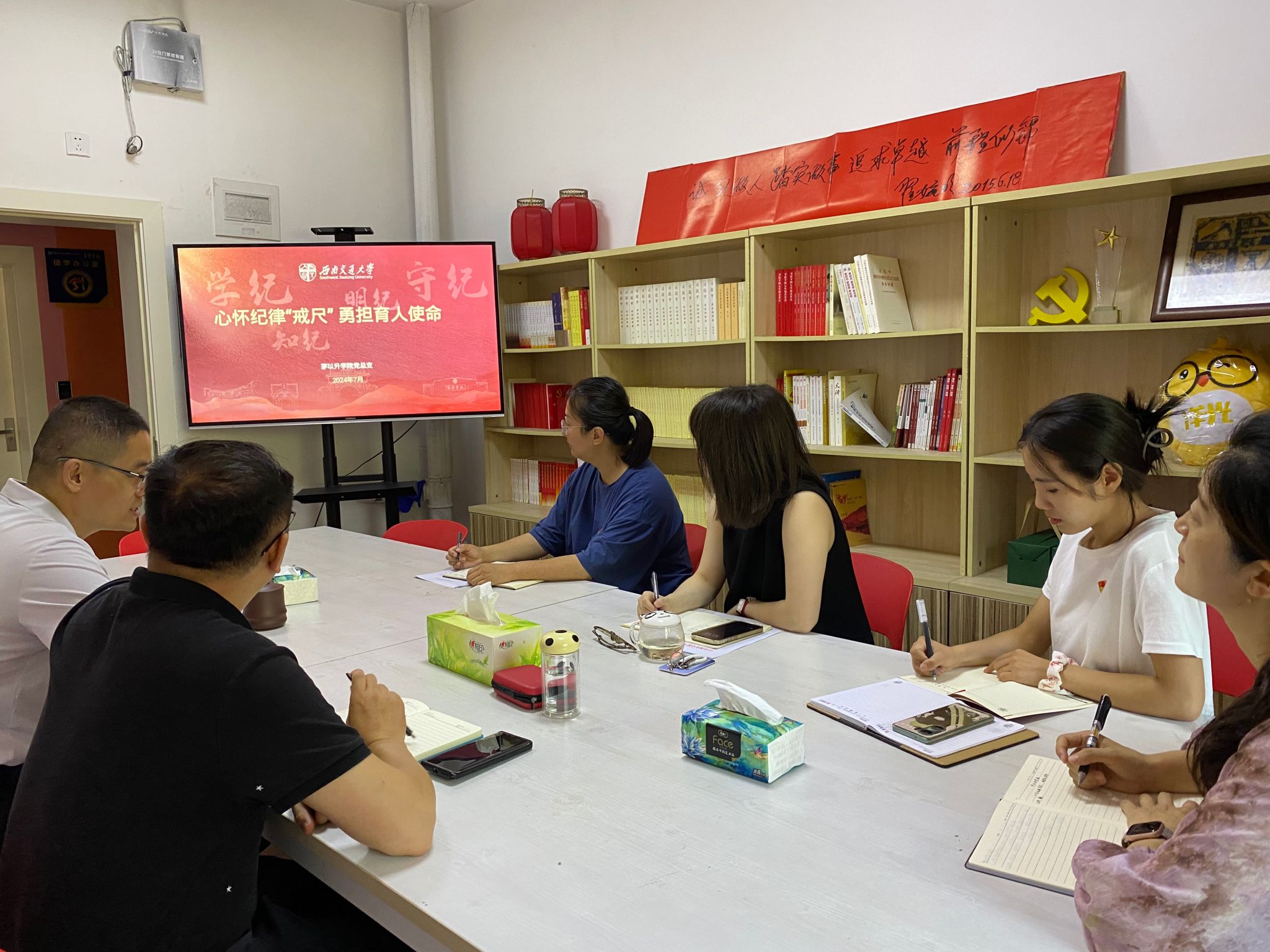 7月1日上午, 腐漫画 组织开展了“心怀纪律‘戒尺’ 勇担育人使命”主题党日活动,党总支书记李毅为教工党支部讲授纪律专题党课。推进党纪学习教育走深走实,引导师生党员做到学纪、知纪、明纪、守纪。学院党总支副书记杨宏毅、全体教职工党支部党员参加了学习。