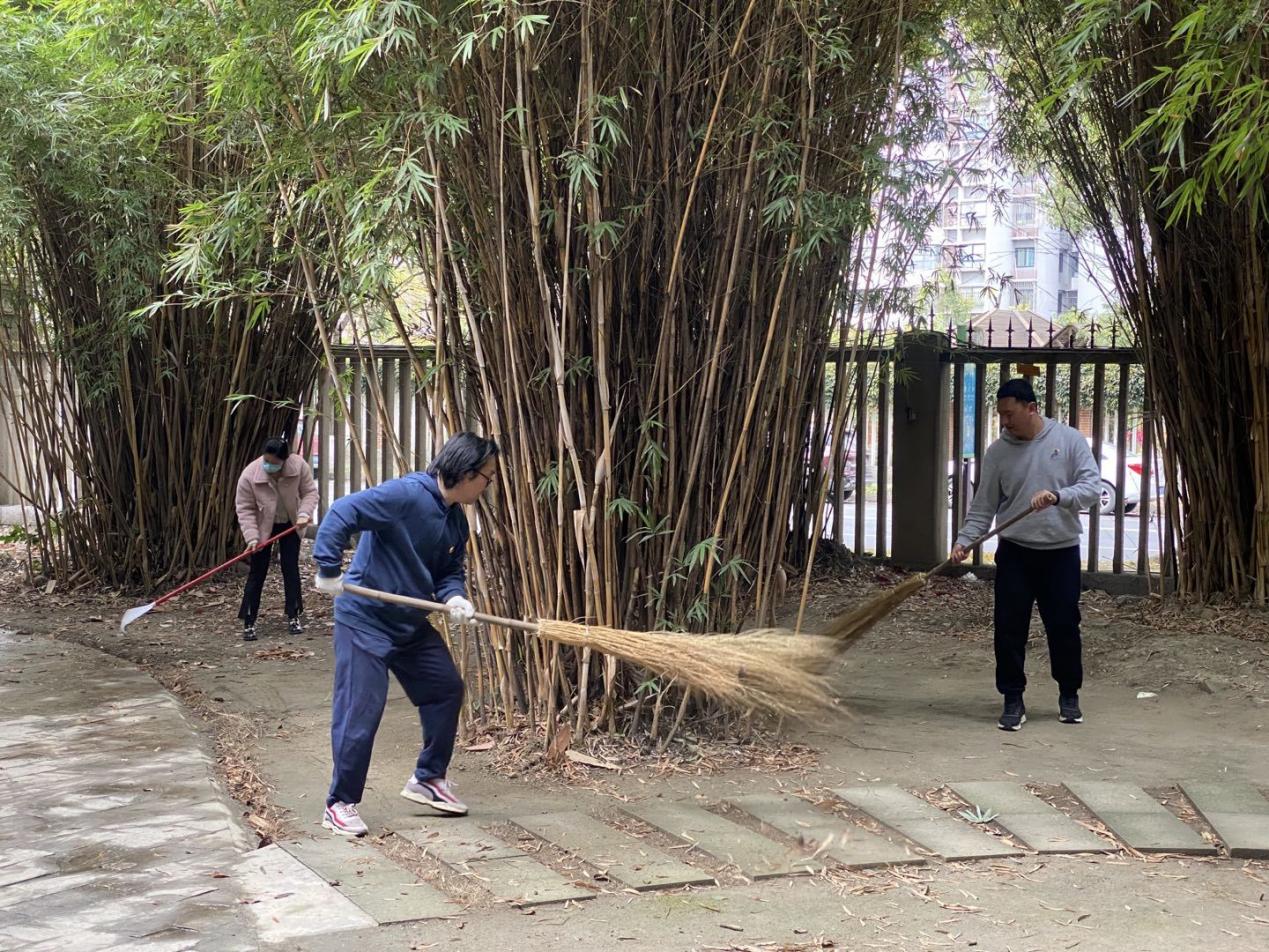 本次主题党日活动内容为“筑梦园”一站式服务育人教工党员示范劳动实践,在劳动实践活动中,党员同志们手持各种工具,耙落叶、扫垃圾、清道路……同时,齐心协力将筑梦园花圃中丛生的杂草铲除,对竹树花草进行修剪整理,并协助工人师傅将枯枝杂物运送上车。经过大家的共同努力,筑梦园沉积的冗枝和遍地的落叶被尽数清理,整个筑梦园整洁有序,富有生气,焕然一新。