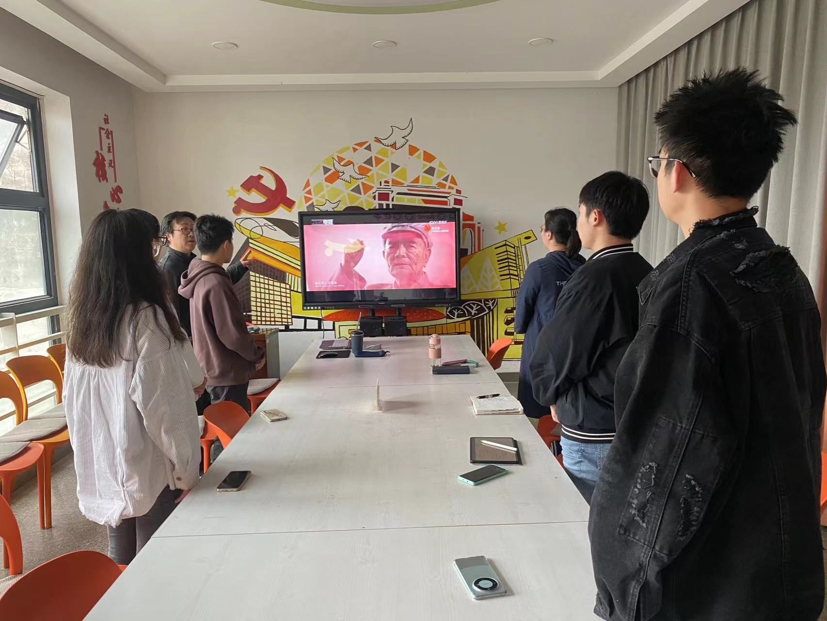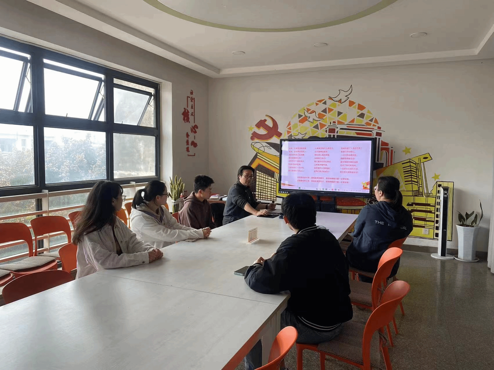 党总支甘霖书记主讲,专职组织员孟涵老师、教务办公室主任王丹老师与吕绍龙、吴佳朔、王有鹏、袁静雯、蒋紫依五位“双卓越”培养项目学生党员参与了本次音乐党课。